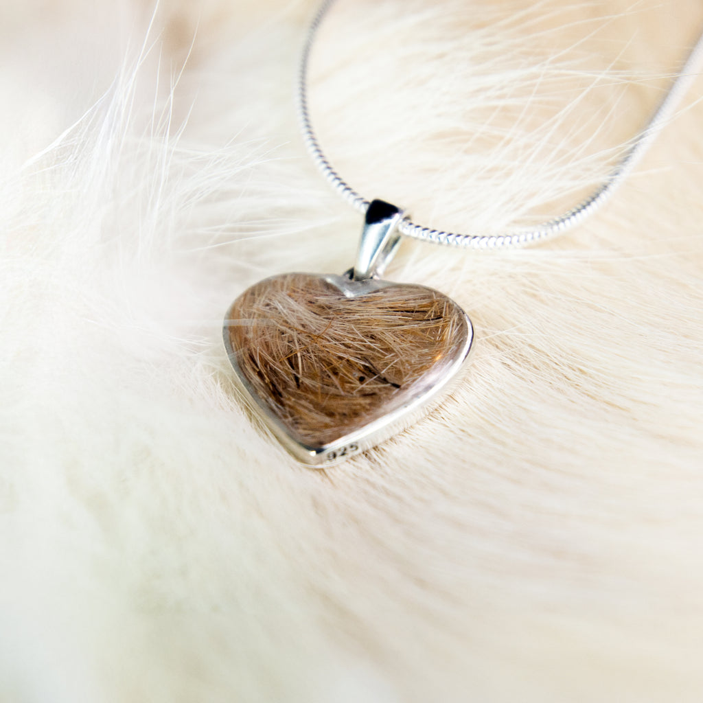Some bonds are forever. This heart-shaped pendant is lovingly handmade to hold a small piece of your companion—dog, cat, or any beloved animal—so they stay with you, always. We carefully arrange your pet’s fur or hair and encase it in a crystal-clear, jewellery-grade setting inside solid sterling silver. The result is a timeless keepsake that catches the light and tells your story.