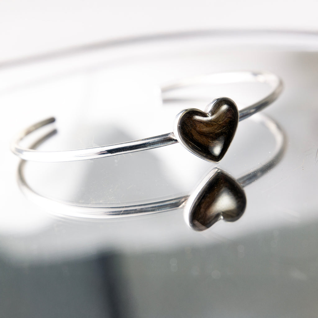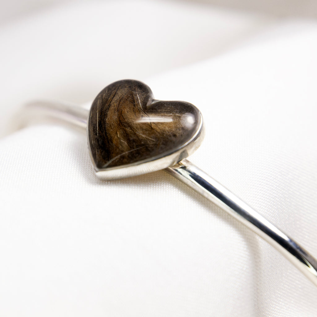 Our Pet Hair Heart Bangle transforms a small lock of your pet’s fur into an elegant piece of memorial jewellery you can wear every day. Meticulously handcrafted in our UK studio from solid 925 sterling silver, this open‑cuff bracelet features a heart‑shaped cabochon filled with your pet’s hair, preserved forever in crystal‑clear resin. Each bangle is made to order, so you know you’re receiving a completely unique keepsake that celebrates your companion’s unconditional love.