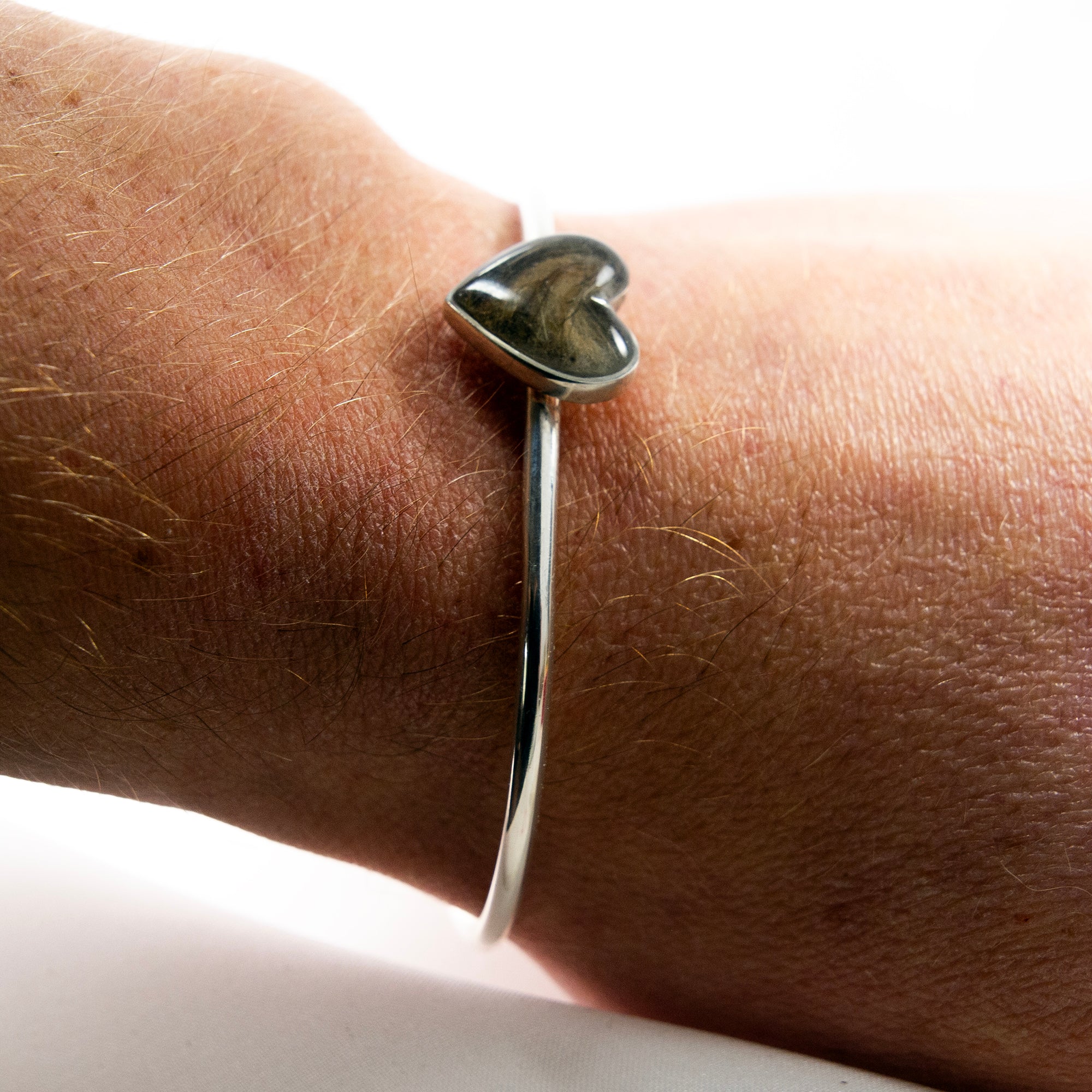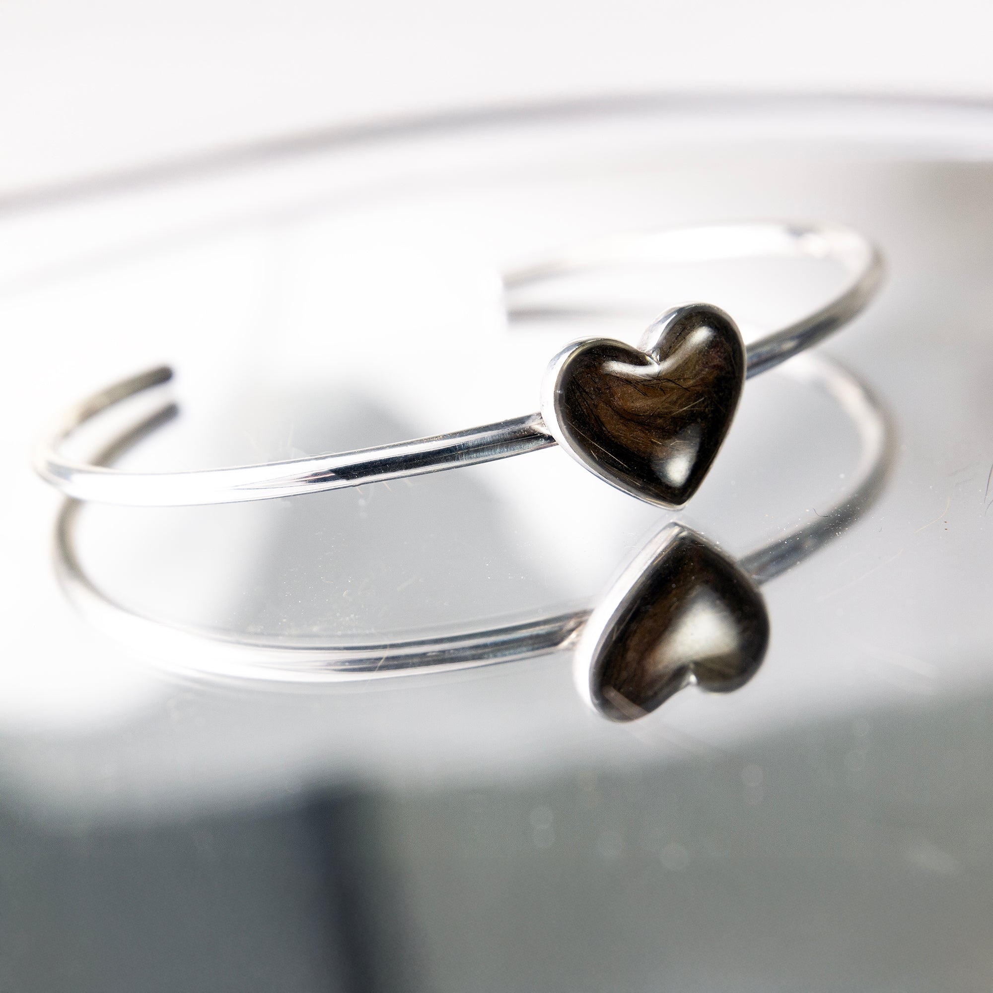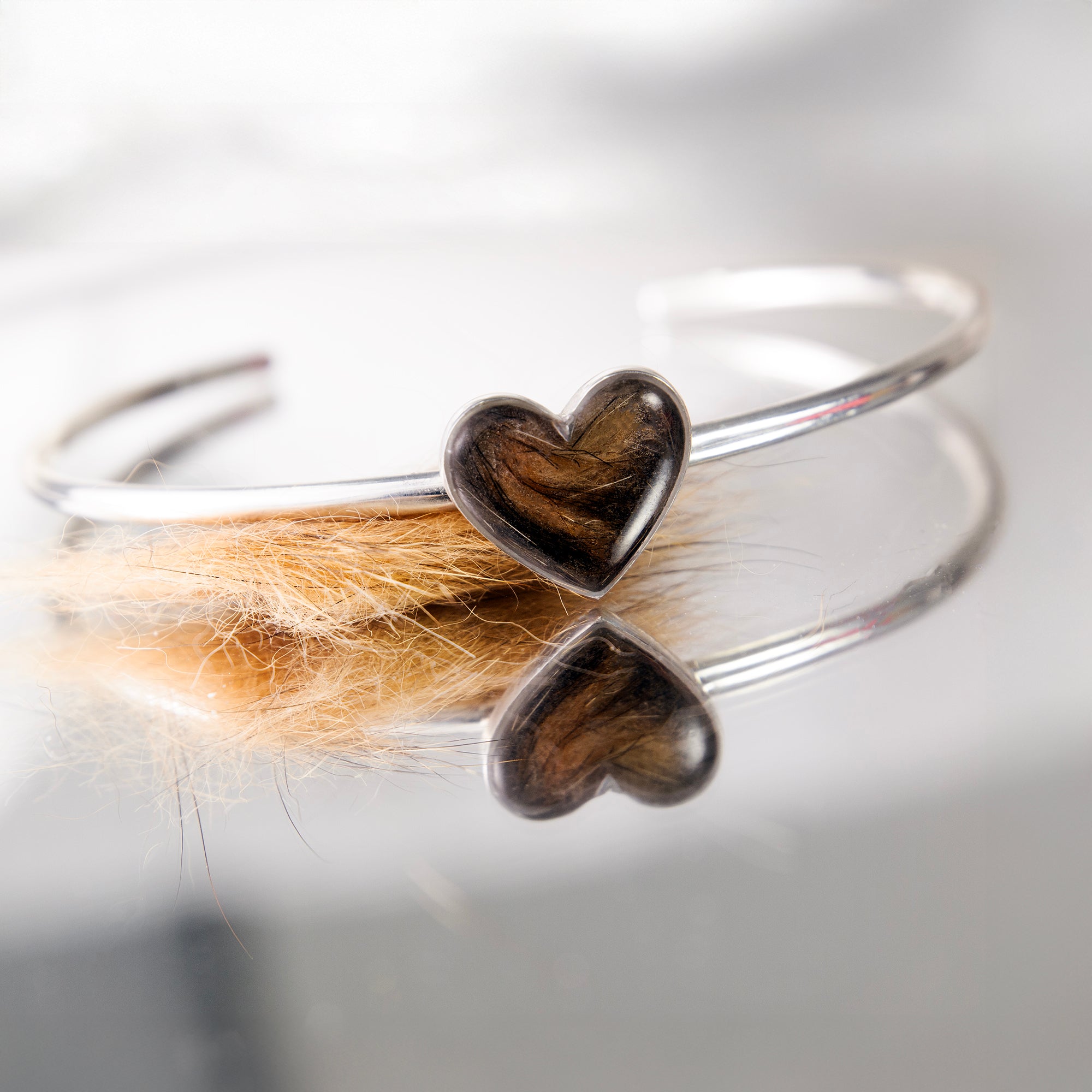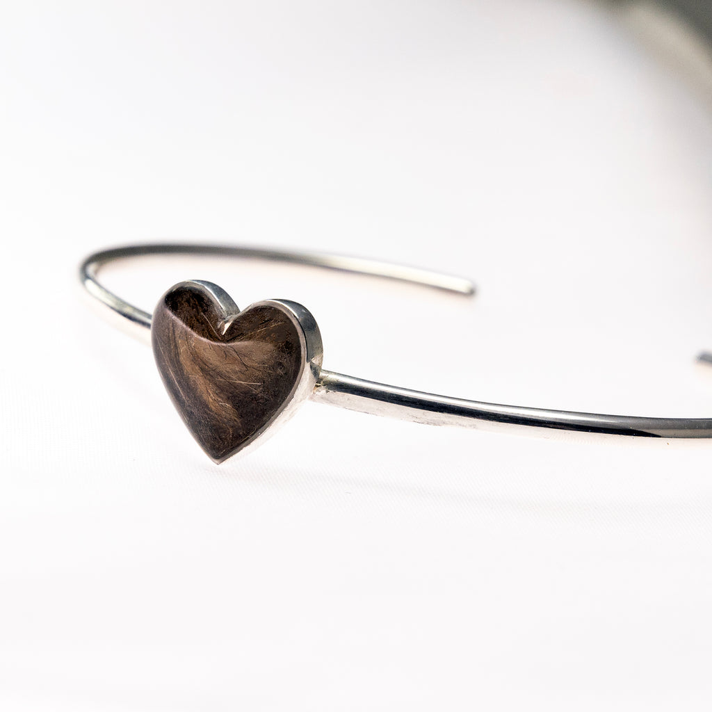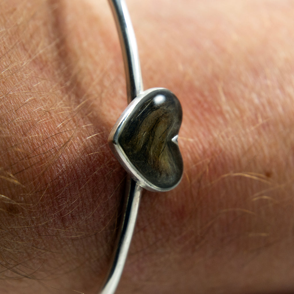 We create your keepsake – Once we receive the fur, we will arrange it by hand inside the heart, pour the resin and set the piece in sterling silver. We polish the bangle to a mirror finish and hallmarked heart stamp on the back.